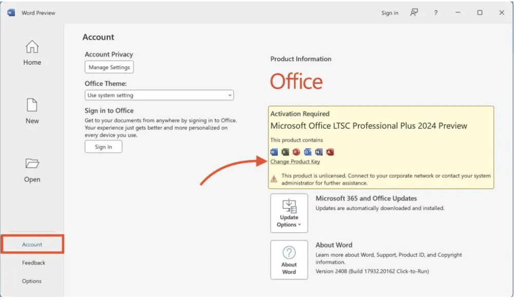 8) Return to the Account section to verify that your Office 2024 LTSC Pro Plus is successfully activated.