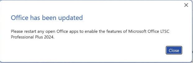 7) Restart the Office application to complete the activation. This ensures all Office 2024 LTSC Pro Plus features are updated and fully functional.