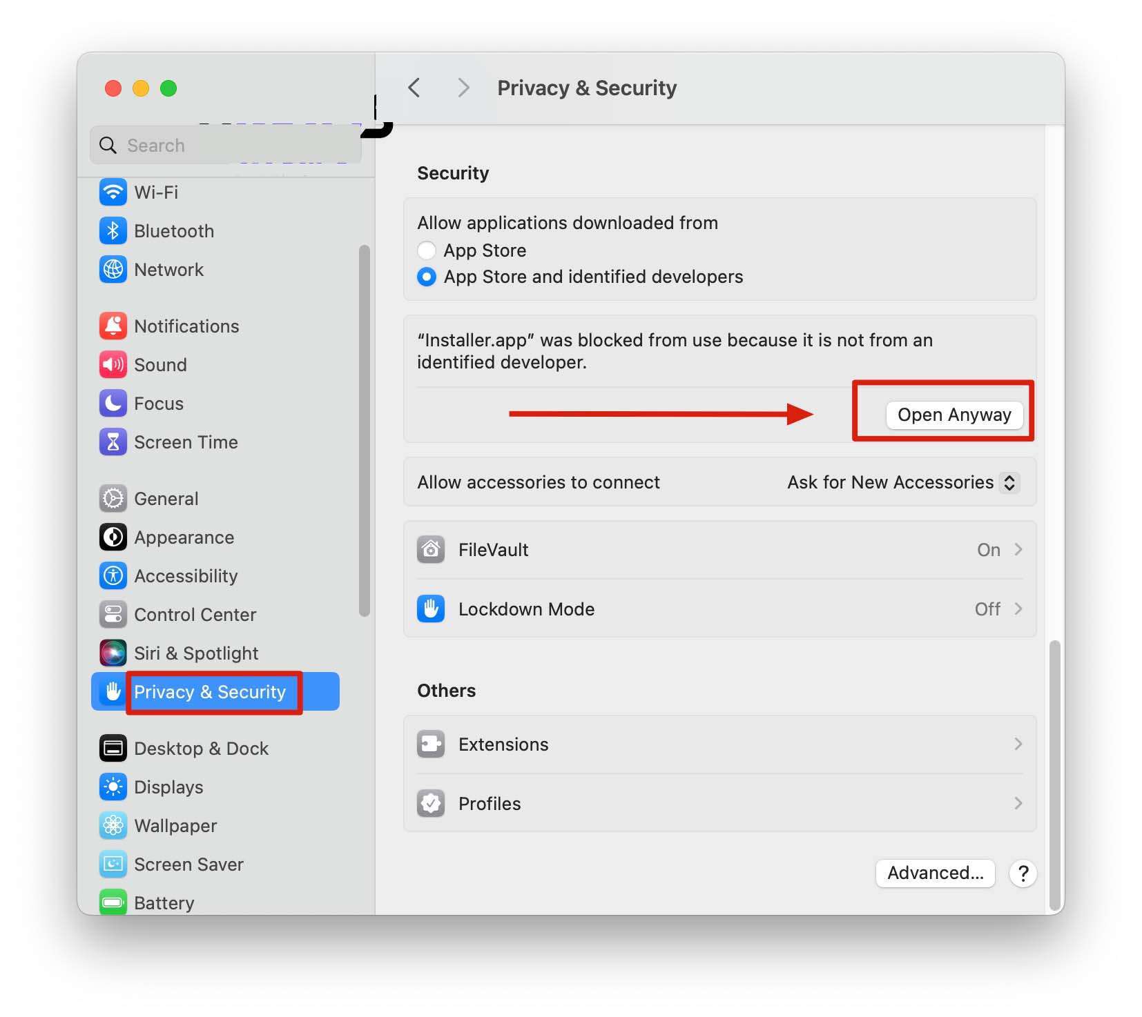 Then open the System Settings, open Privacy & Security, and click [Open Anyway].